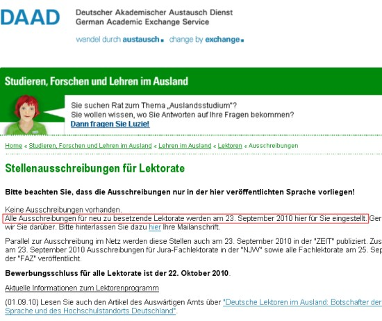 Der DAAD ist der Deutsche Akademische Austauschdienst. Studierende, die ins Ausland wollen, bewerben sich dort unter anderem für Stipendien und bekommen auch eines, mit etwas Glück (plus unzähligen Kniefällen, Nervenzusammenbrüchen, hundert Ave Marias usw...). Ich habe einige Monate in Shanghai als Deutschlehrerin gearbeitet und dort DAAD-Lektoren kennen gelernt. Bei einem Auslandslektorat handelt es sich um einen Aufenthalt auf Zeit – das Minimum sind zwei, das Limit fünf Jahre. Es beinhaltet vor allem Studienberatung und Lehrtätigkeit an der ausländischen Hochschule.